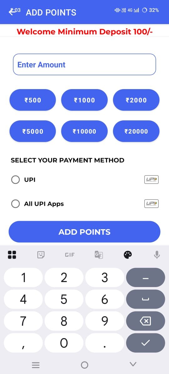 Answer: We are working with Automatic Point Add System. You can add points by clicking "Add Points" button available in wallet section. Once you fill the required amount and process it, we will show you all UPI systems installed in your mobile. You can pick any payment UPI and pay with UPI. Once your payment is received in our wallet, we will add points your wallet automatically and all this process is automatic.